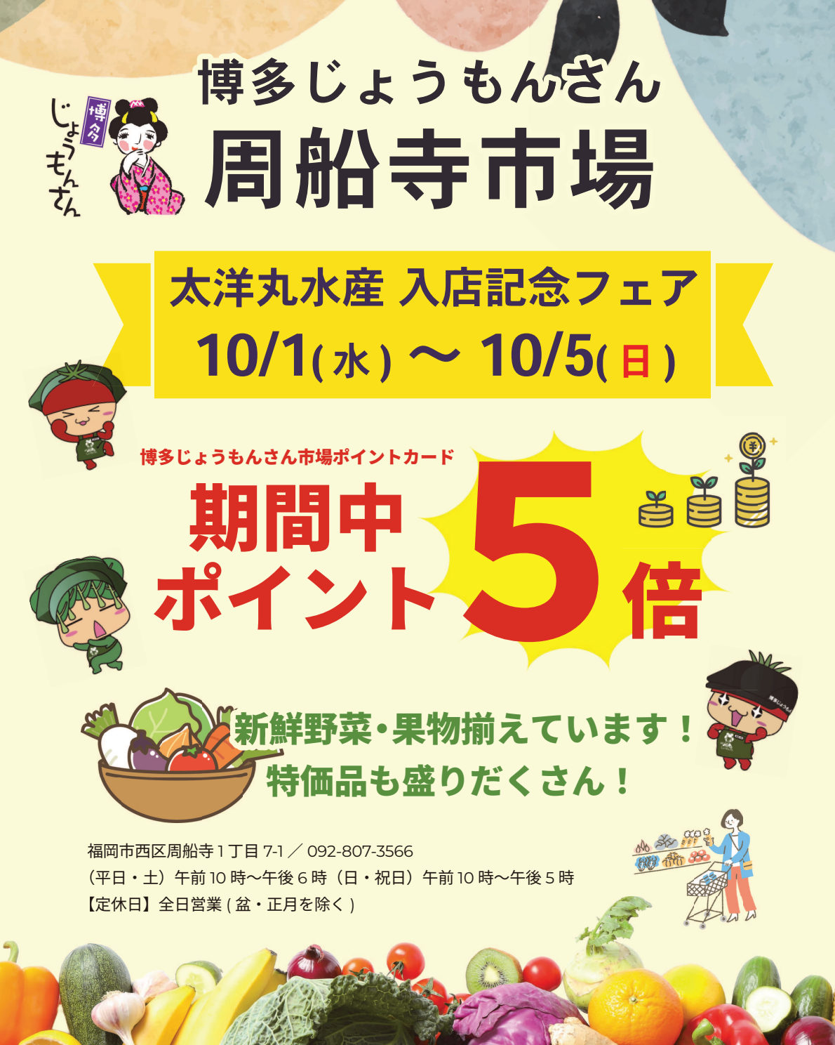 期間中は、新鮮で美味しいお魚の特売や周船寺市場お買上ポイント5倍などの企画をご用意しております。