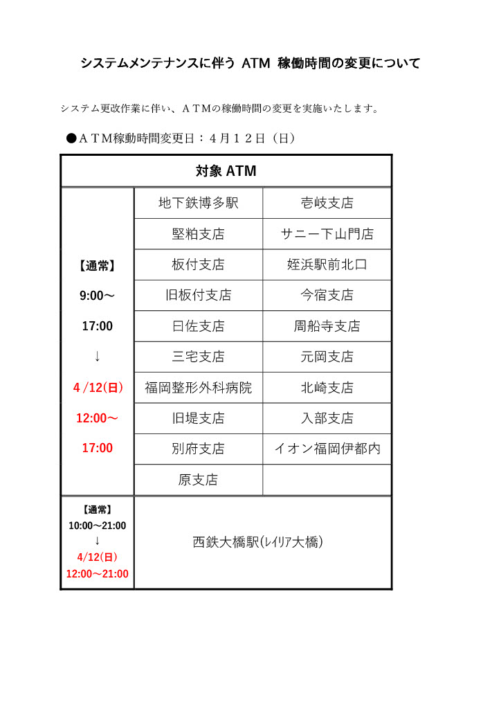誠に勝手ながら4月12日(日)のATMの稼働時間は12時からとなります。(9:00~12:00はお取り扱いできません。)
