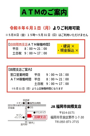令和8年5月11日(月)より「田隈支店」へ統合・移転いたします。