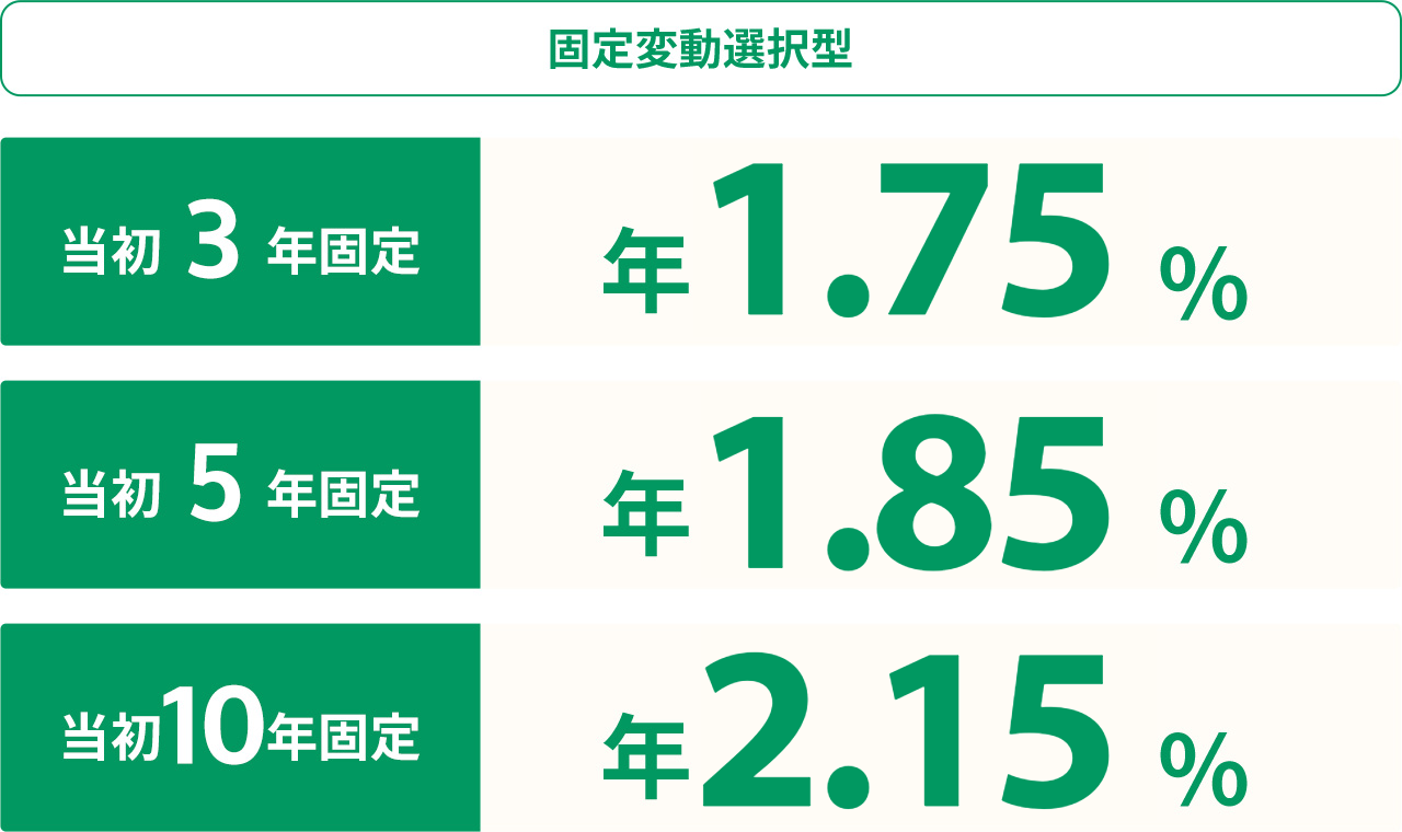 固定変動選択型 3年固定: 3.55%、5年固定: 3.70%、10年固定: 3.90%