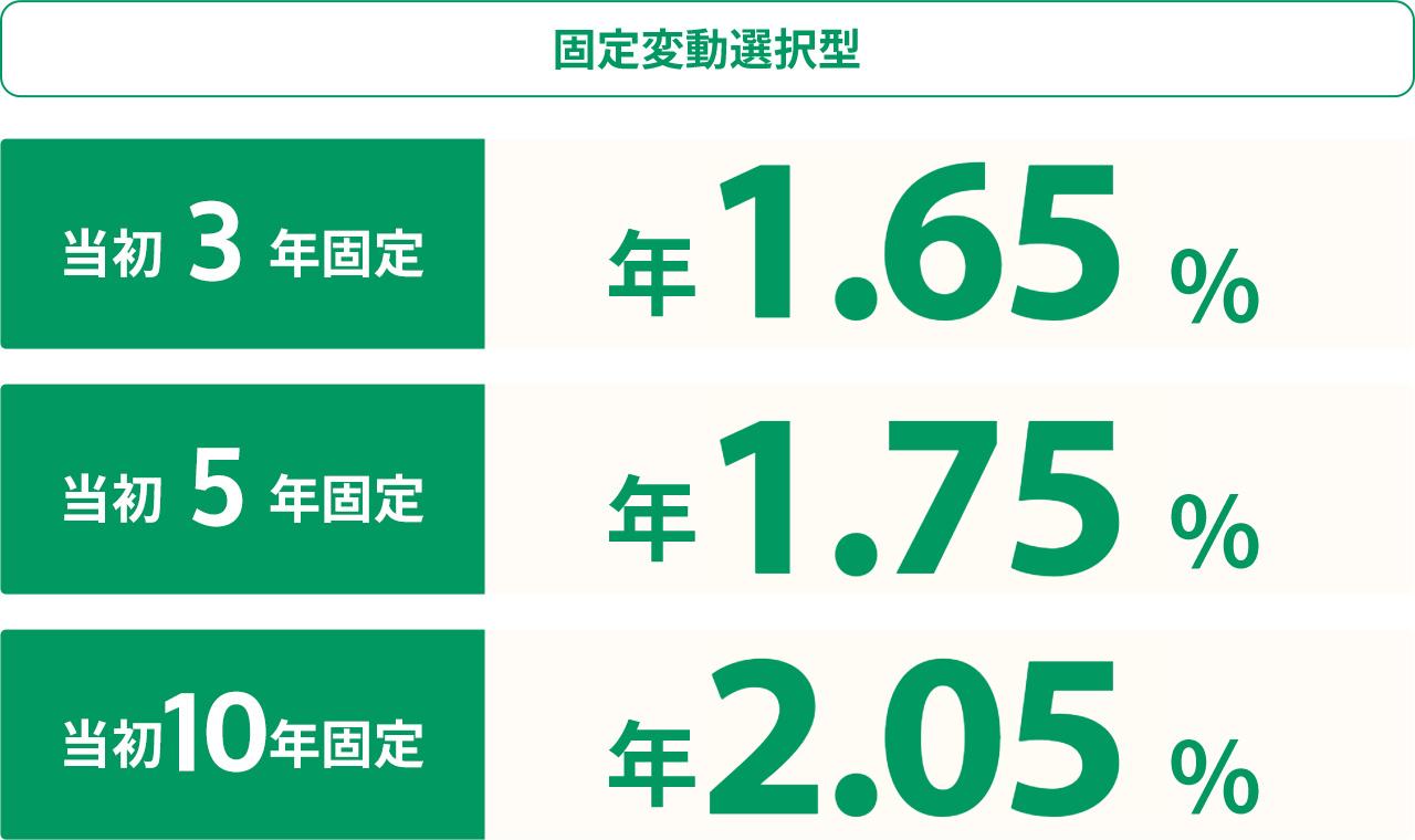 固定変動選択型 | 3年固定: 3.45%、5年固定: 3.60%、10年固定: 3.80% |
