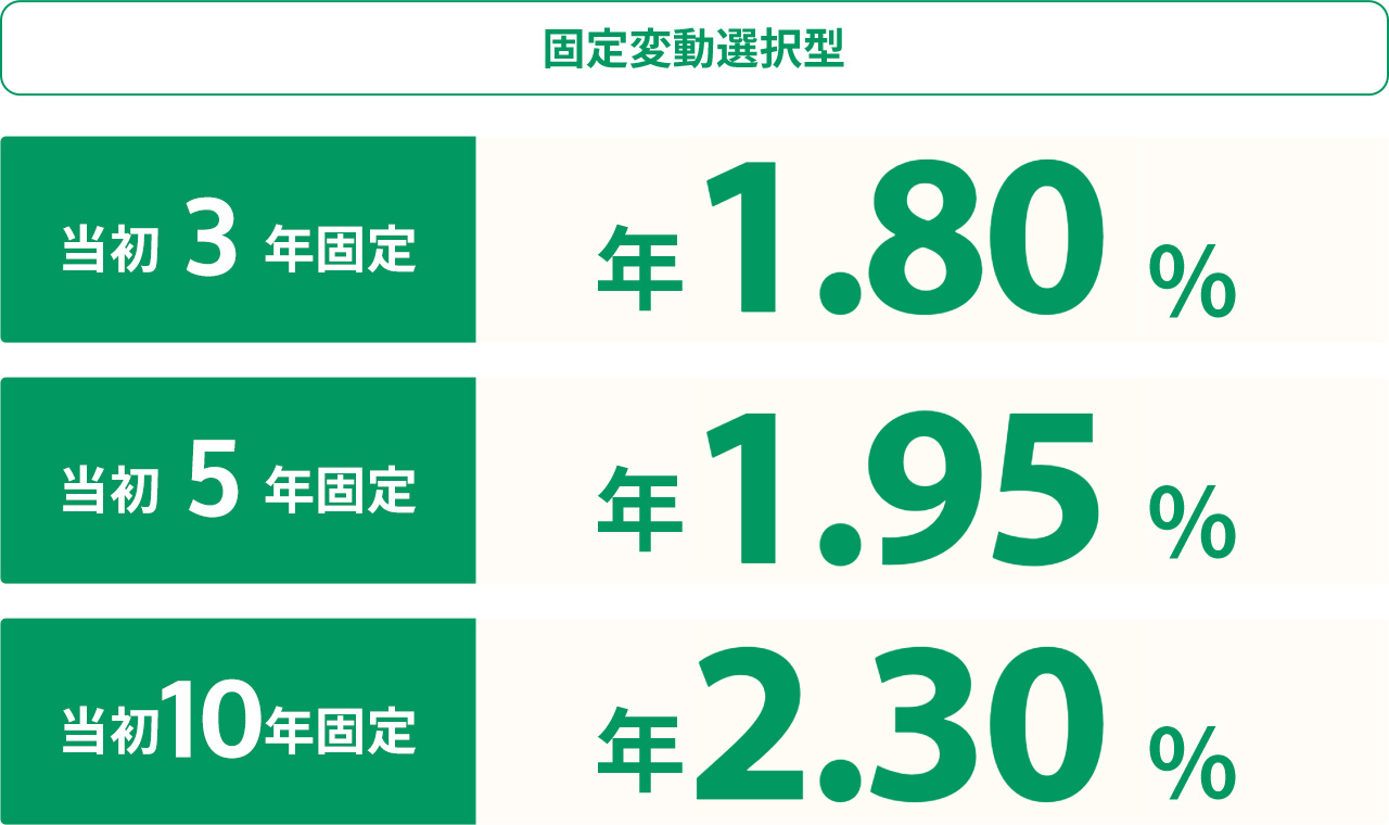 固定変動選択型 3年固定: 3.60%、5年固定: 3.80%、10年固定: 4.00%