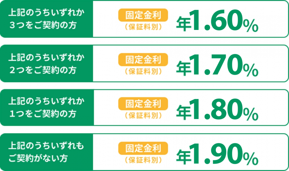 | 金利 | 1.JA福岡市のローン契約者 2.JA福岡市の組合員 3.JAカード契約者 4.LINEお友達登録(JA福岡市公式/博多じょうもんさん市場) 5.JAネットバンクまたはJAバンクアプリプラス登録者 6.JAネットローン経由の申込 ・いずれか3つご契約の場合: 年1.6% ・いずれか2つご契約の場合: 年1.7% ・いずれか1つご契約の場合: 年1.8% ・どのご契約もない場合: 年1.9% ※ 同時申込可能です。 |