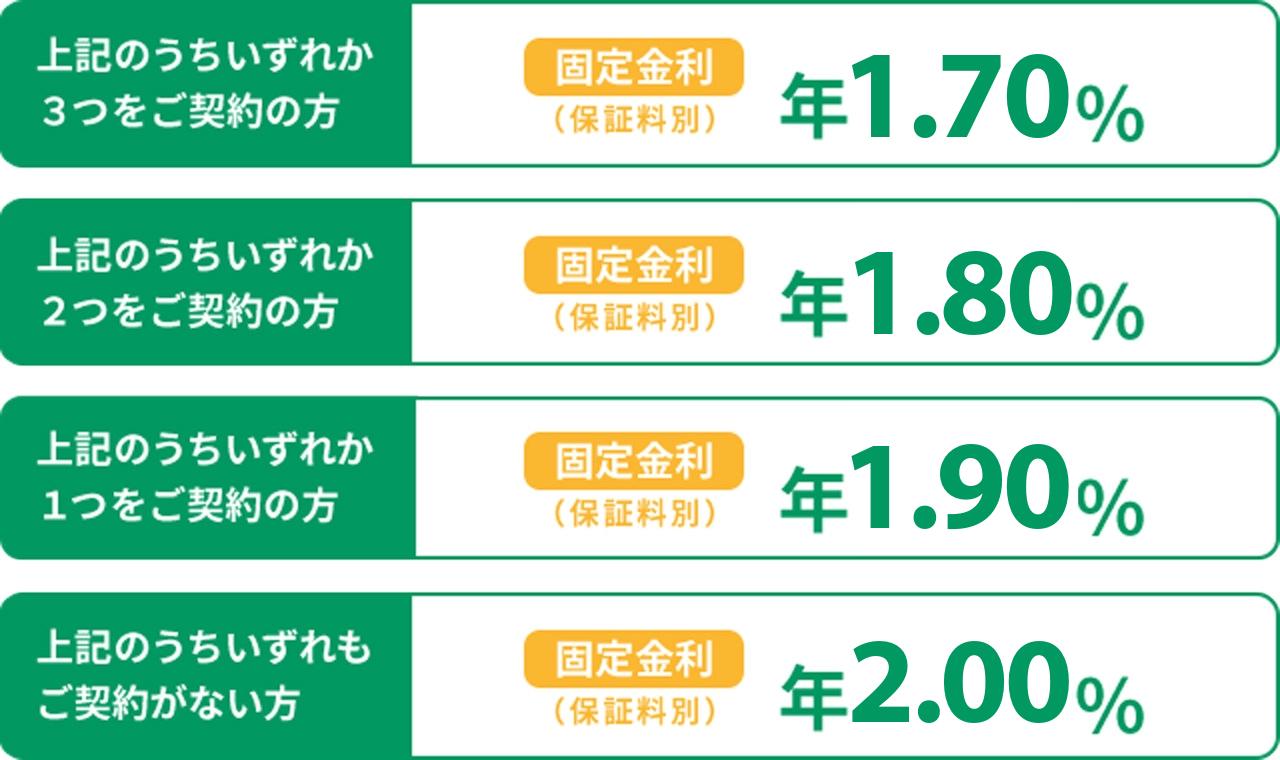 | 金利 | 1.JA福岡市のローン契約者 2.JA福岡市の組合員 3.JAカード契約者 4.LINEお友達登録(JA福岡市公式/博多じょうもんさん市場) 5.JAネットバンクまたはJAバンクアプリプラス登録者 6.JAネットローン経由の申込 ・いずれか3つご契約の場合: 年1.7% ・いずれか2つご契約の場合: 年1.8% ・いずれか1つご契約の場合: 年1.9% ・どのご契約もない場合: 年2.0% ※ 同時申込可能です。 |